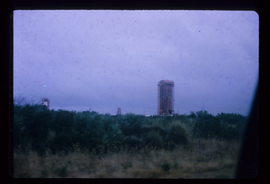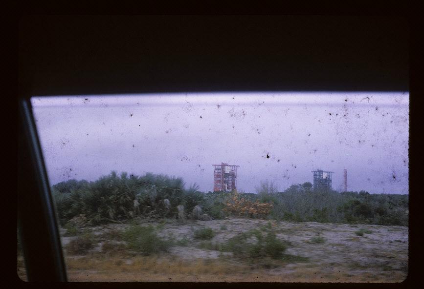 Service and umbilical towers, apparently LC 17, built in 1956-57 for USAF Thor missile testing and used around this time for early Delta launches. LC 17 was upgraded in the 1980s for the larger Delta IIs.