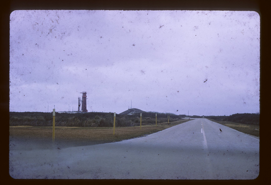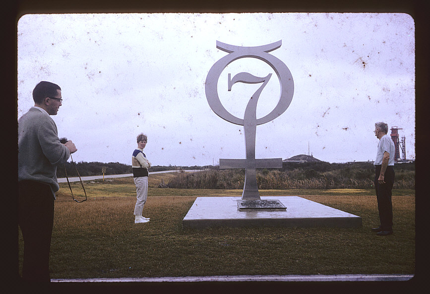 Mercury 7 monument. The mound in the background is probably the LC 14 blockhouse. The tower to the right is LC 14 (compare to this and this), with something (an Atlas-Agena?) on the pad. Compare to a more recent view of the monument.