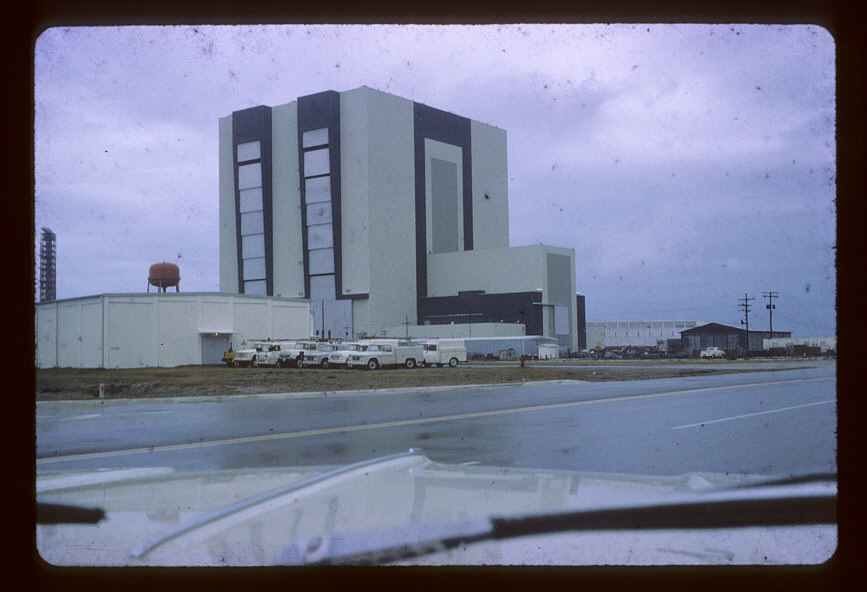 The newly-completed VAB, without the familiar markings. The LC 39 LCC building is on the right, and a LUT is nearing completion at the left edge of the frame. The angle suggests it’s taken from the area in the lower left corner of this more-recent image.