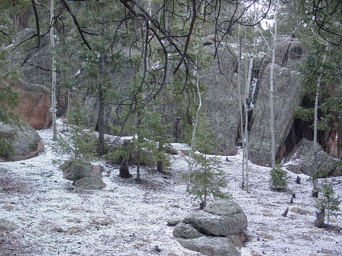 (Click on the image and you'll actually see the falling sleet. The sleet on the ground accumulated in about three minutes, the time it took me to notice it and grab my camera. This is what I get in lieu of thunderstorms, thanks to the altitude and topography.)