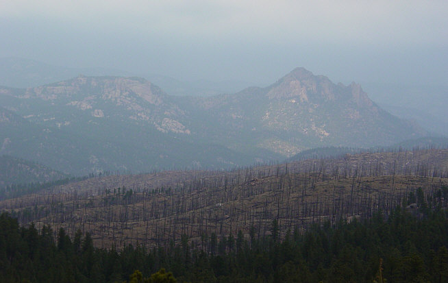 Damage from the 2002 Hayman Fire, seen through a haze reminiscent of New Orleans in summer. Along the road in this area, the county has put up 'Barbasol' signs, reminding visitors via rhyme that all this damage to a forest they admire was the result of a single fire. (No mention of poor forest management practices or heartbreak-induced arson...but I imagine that kind of thing is difficult to fit onto little signposts.)